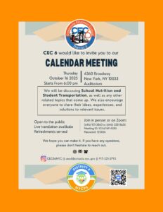 The CEC 6 extends a warm invitation for you to join us at our upcoming Calendar meeting, Thursday, September 16th, starting at 6:00 PM.
