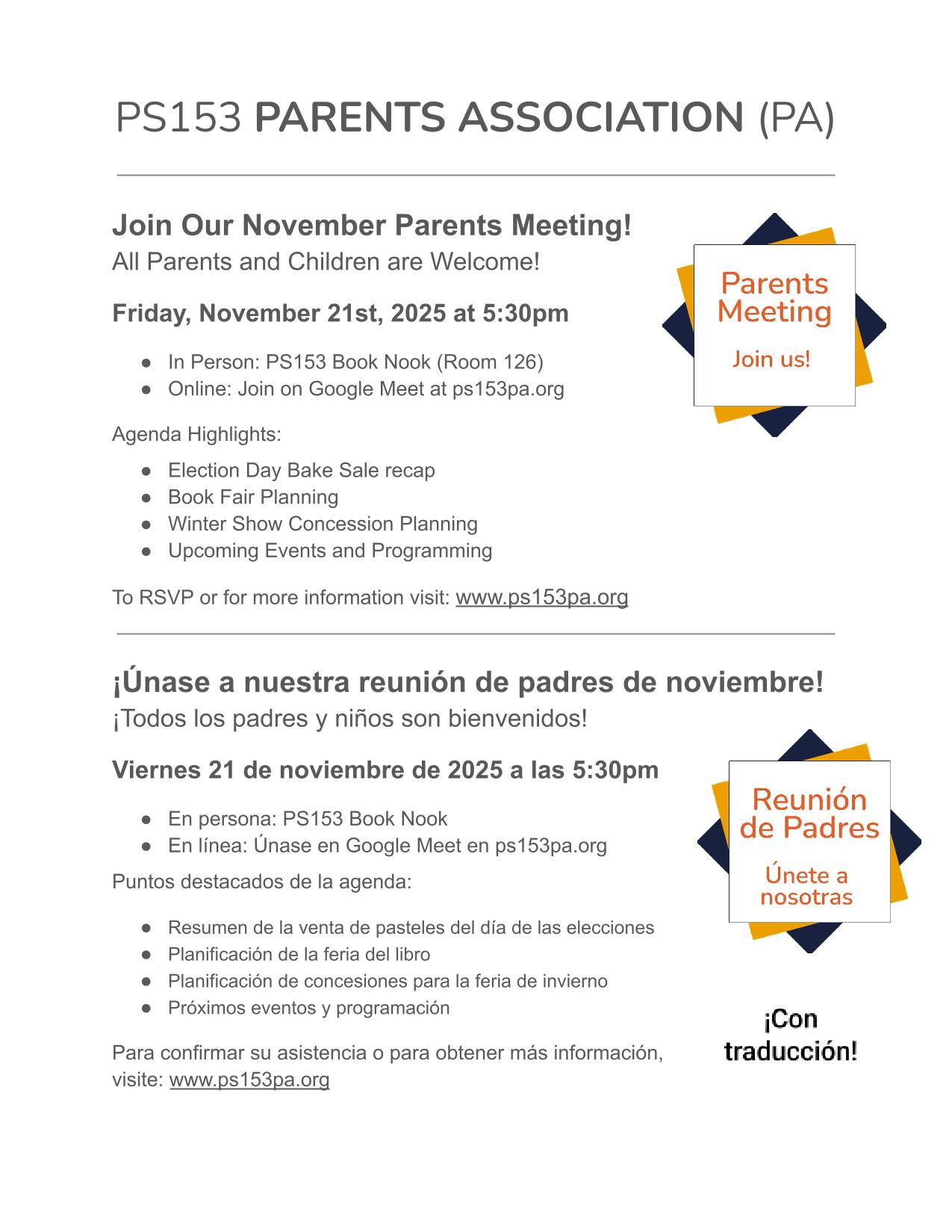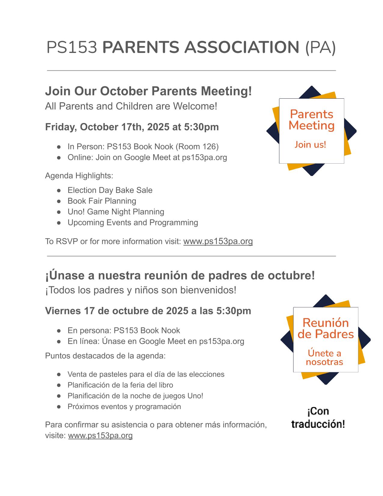 Learn more about the PS153 Parent’s Association and join us for the first meeting of the school year! We’ll be meeting at the Book Nook in person and online on Google Meet. All are welcome in person, families and children. Meeting Resources: By-Laws Proposal 2025-2026 PA Budget – 9_19_2025